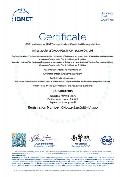 استاندارد:ISO9001 عدد:00122Q33631R5M/3400 تاریخ صدور:2022-05-26 تاریخ انقضا:2025-05-28 محدوده / محدوده:Design,Development and production of wood plastic profiles صادر شده توسط:CQC |